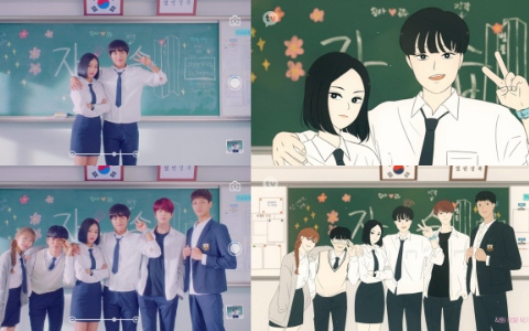 從髮型到表情和姿勢,再到略顯下垂的領帶、手錶的顏色和大小,完美演繹了角色的細節,甚至連角色之間的關係都隱約可見。 背景黑板上畫的圖畫、教室的室內裝修都好像是從網絡漫畫中跳出來的,細膩的細節讓原作粉絲更加關注。