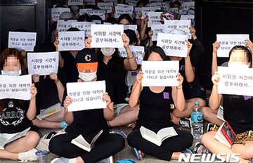 然而9月即將開放的這個政策,被學生抨擊將變成「用錢就可以買到學位」,屬於名門學校的梨花大學學生深怕會壞了學校招牌,而且對刻苦考試取得學位的人不公平,因此進行了抗爭,甚至在酷暑下佔據行政大樓,可以看到新聞照上有人拿電風扇救援的畫面