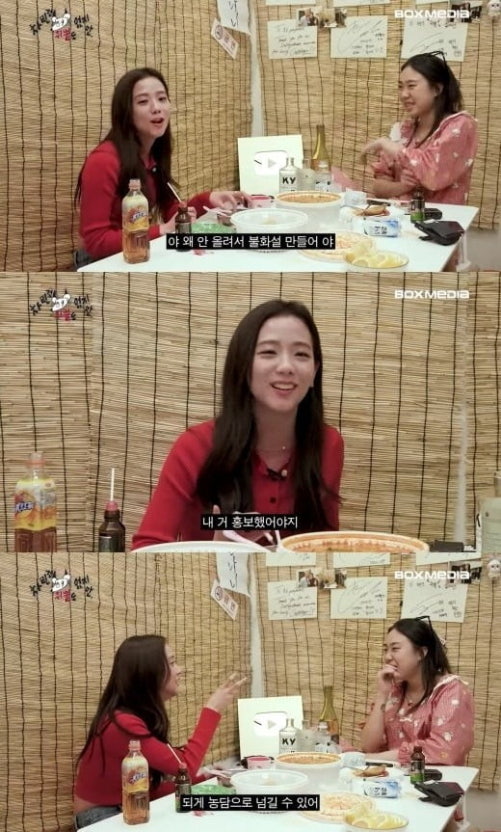當天Jisoo出演《雖然沒準備什麼菜》,泳知開心地一邊倒酒一邊表示「我要來好好測量妳的酒量」。喝了濃度超高的酒後,Jisoo表示「我好像知道為什麼要舔貼紙了,以前摺色紙的時候也吃過爆炸,有點鹹鹹的還蠻好吃的」,也接著說「吃了衛生紙發現很難吃,就不再吃(紙)了」,讓全場笑出來。
