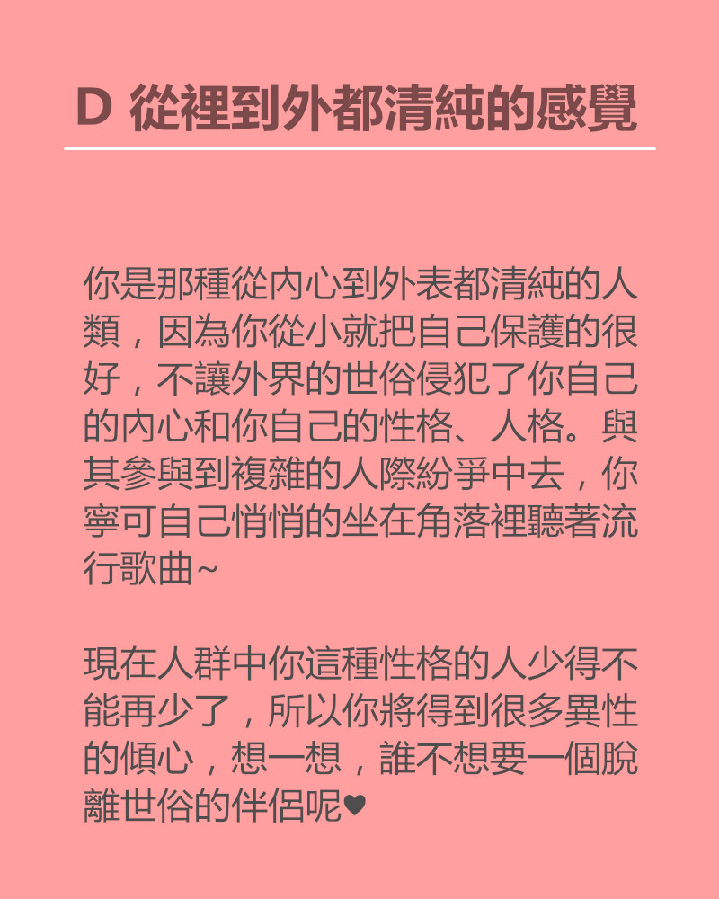 在別人的印象中,你是一個什麼樣的人呢?有些人會顯得成熟,有些會顯得幹練,有些則是嫵媚,當然,還有的人是清純。你是清純的那一類嗎?快來測測看吧♥~