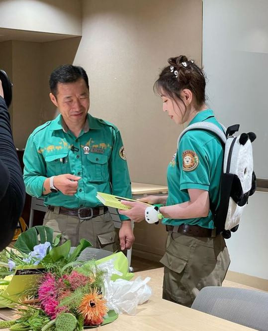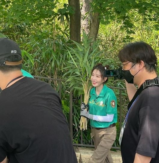 照片中可以見到寶兒身穿愛寶樂園飼育員的制服,寶兒與姜鐵原飼育員一起拿著要餵給大貓熊福寶的竹子移動,一路上都是開心的表情。