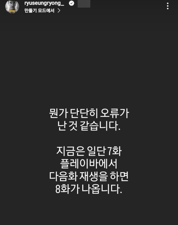 Actor Ryu Seung-ryong posted a new story on his Instagram story, saying, "It seems like a serious bug has occurred." He then provided a tutorial, "You can go ahead and click on the seventh episode, and then click 'next episode' in the player. This way, you will be able to watch the eighth episode."