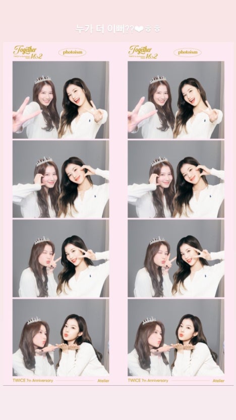 还有女团TWICE成员定延穿着衬衫披着毛衣跟自己的相框合照比出合体爱心、还有一起托腮等互动姿势。另外则有同团成员Sana带着皇冠跟自己的相框合比「耶」、一起比出脸颊爱心等。