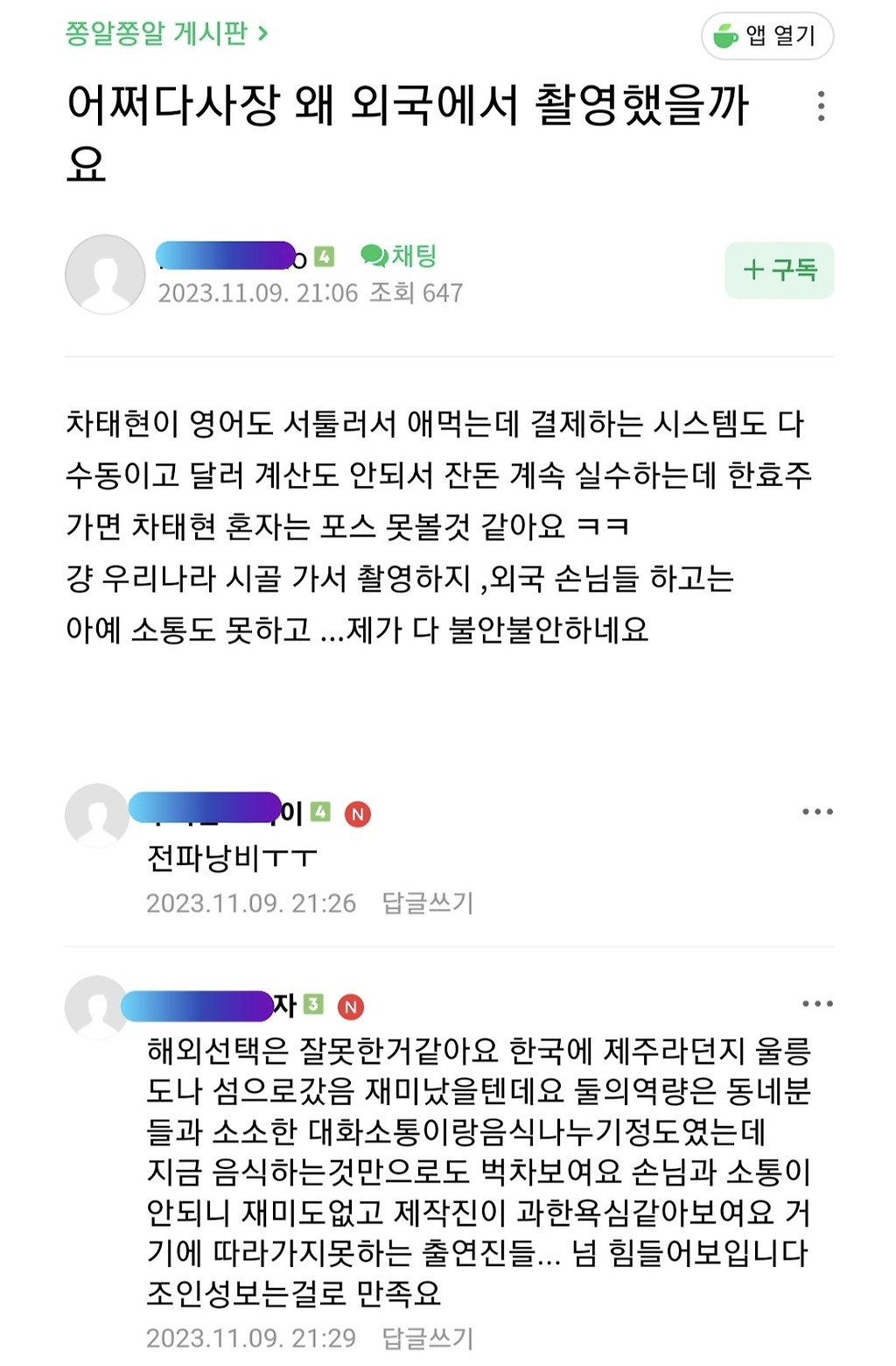 網友還截下了其他論壇的留言「去海外好像是錯誤的選擇,如果選一個韓國的島嶼,像是濟州島或鬱陵島之類的,應該會很有趣,兩個老闆最棒的就是會跟居民聊天,但現在光是做料理就忙翻,沒辦法跟客人互動,就變得不有趣,讓人覺得是製作單位野心太大,但出演者卻沒辦法配合…讓人看得很累…不過看到趙寅成我就滿足了」、「感覺偶然成為社長慢慢走向生意天才+尹食堂的路線,所以我就不看了~」、「到第二集為止都還很有趣,第三集好無聊」、「為什麼飯捲都讓尹敬浩包?他好可憐」。