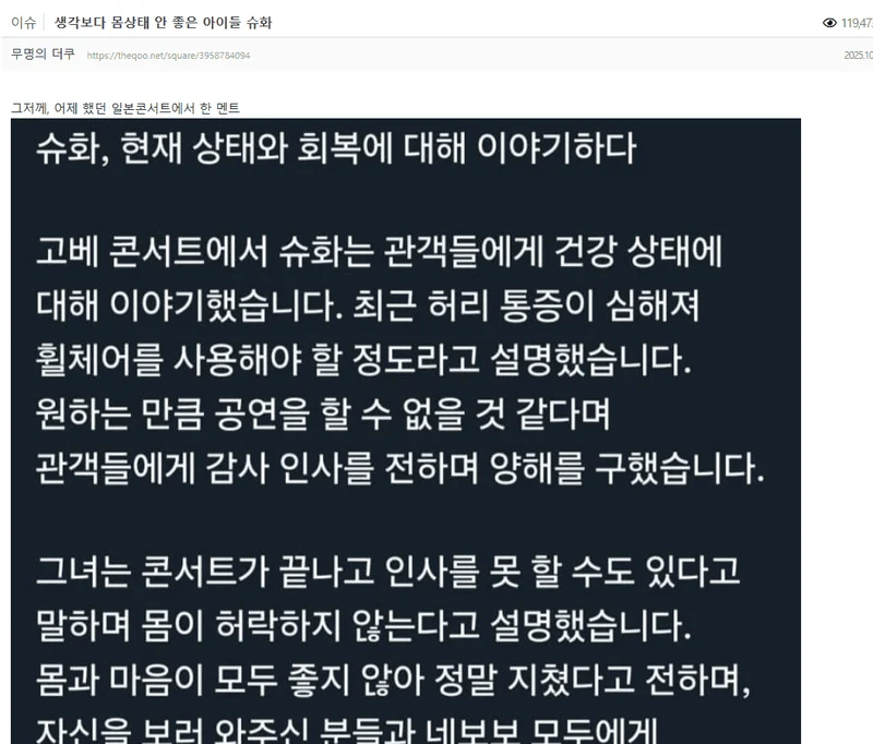 女團i-dle於10月18日、19日在日本舉辦演唱會,成員舒華驚傳健康狀況不佳,甚至嚴重到必須靠輪椅移動,引起粉絲與網友高度關注。一篇名為《身體狀況比想像中更差的i-dle舒華》的文章登上韓國論壇theqoo熱帖排行榜,引爆熱議。