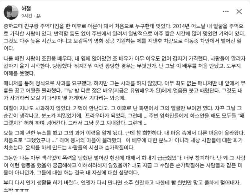 才剛因「少年犯前科」與多起醜聞而宣布退出演藝圈的南韓演員 趙震雄,風波仍持續延燒。這次連紀錄片導演 許哲(허철) 也跳出來爆料,稱自己 2014 年曾在車上遭趙震雄無預警拳毆多次,整個過程毫無反抗之力,但如今竟然表示「願意原諒」,讓網友全看傻。