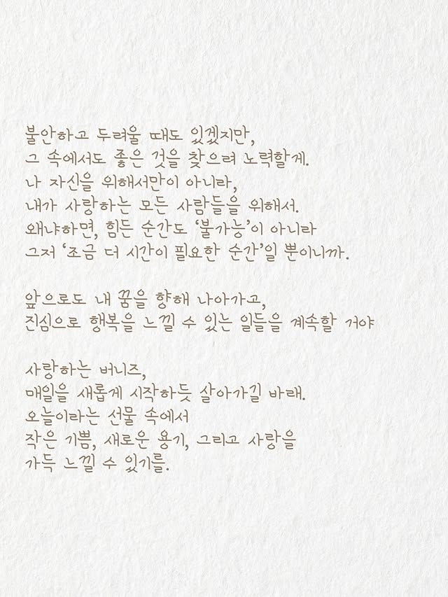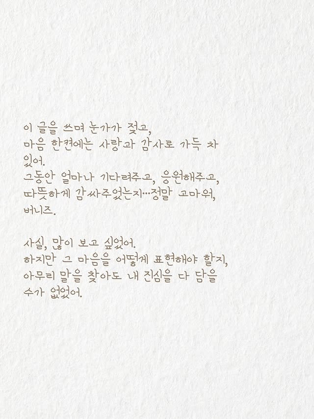 她也吐露自己內心的不安與期待,坦言即使會感到害怕與焦慮,仍會努力在其中找到美好的事,不只是為了自己,也是為了她所愛的每一個人,「因為再艱難的時刻,也不是『不可能』,只是『需要多一點時間』而已。」最後,她向粉絲溫柔喊話,表示會繼續朝夢想前進,做那些能讓自己真正感到幸福的事,「真的很期待有一天,能再和你們見面,一起笑、一起聊天。」