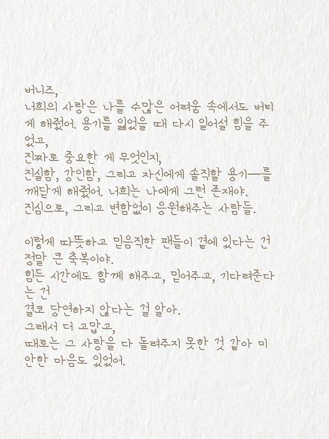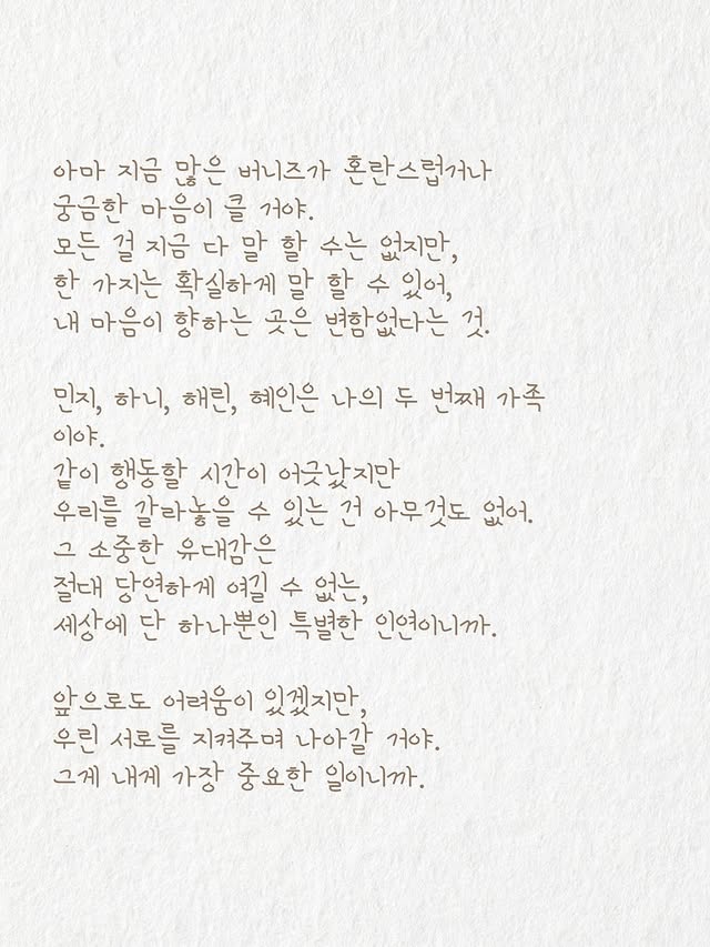談到 NewJeans 成員時,她更毫不掩飾情緒,直言 Minji、Hanni、Haerin、Hyein 是她「第二個家人」。她強調,就算現在彼此的步伐暫時不同,也沒有任何事情能把她們拆散,「那份羈絆是這個世界上獨一無二、無可取代的。」她也喊話,未來不管遇到多少困難,大家都會彼此守護、一起往前走,「那對我來說是最重要的事。」