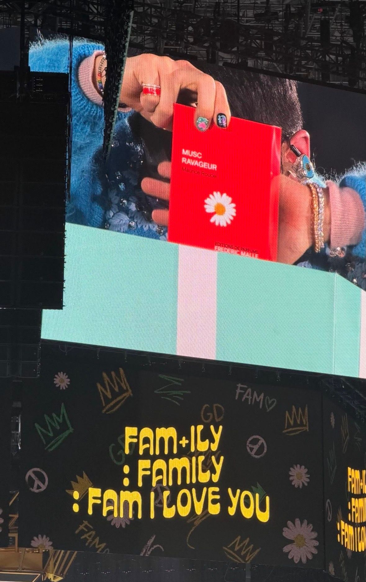 更誇張的是,現場灑落的紙花也暗藏巧思,紙屑正反兩面都不同,還印有 GD 的親筆手寫字。第一天活動結束後,不少粉絲在後記中分享,紙花竟然帶著淡淡香氣。隨後有粉絲透露,GD在整個演出場地噴灑了他平時愛用的香水——FREDERIC MALLE 的 MUSC RAVAGEUR。