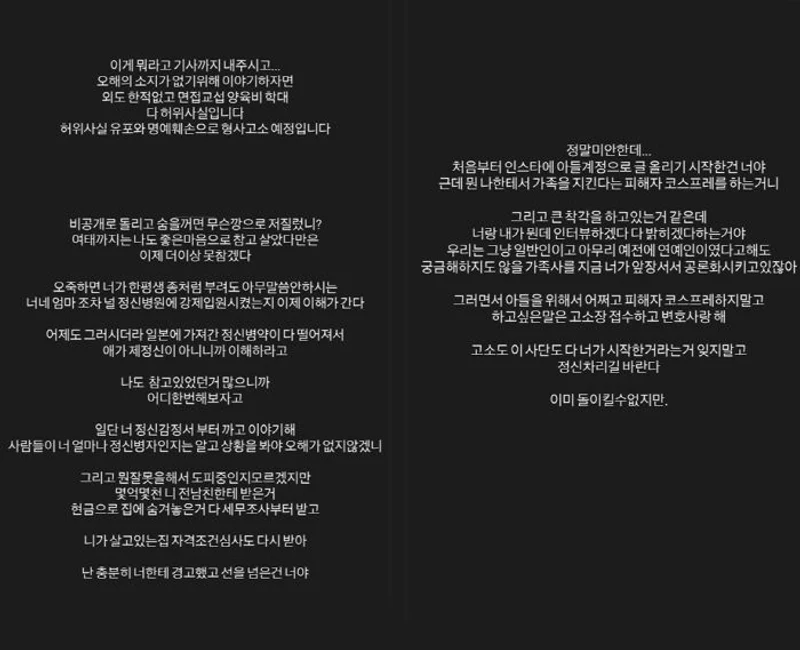 A女最後還表示:「還要說什麼事情要聽雙方說法?我一個人養孩子、因為他外遇才離婚,這些早就是大家都知道的事。為什麼還要讓受害者承受更大的傷害,甚至連自己的兒子也想一起拖下去?他真的是爸爸嗎?我真的氣到發抖,這種人根本不可能改過自新。不要再散布假消息模糊焦點,也不要再裝作不是那樣。我會全部公開,包括他現在到底靠什麼賺錢、他私下怎麼談論演藝圈人士,還有他家到底是什麼樣的家庭,我都會攤開來講。」