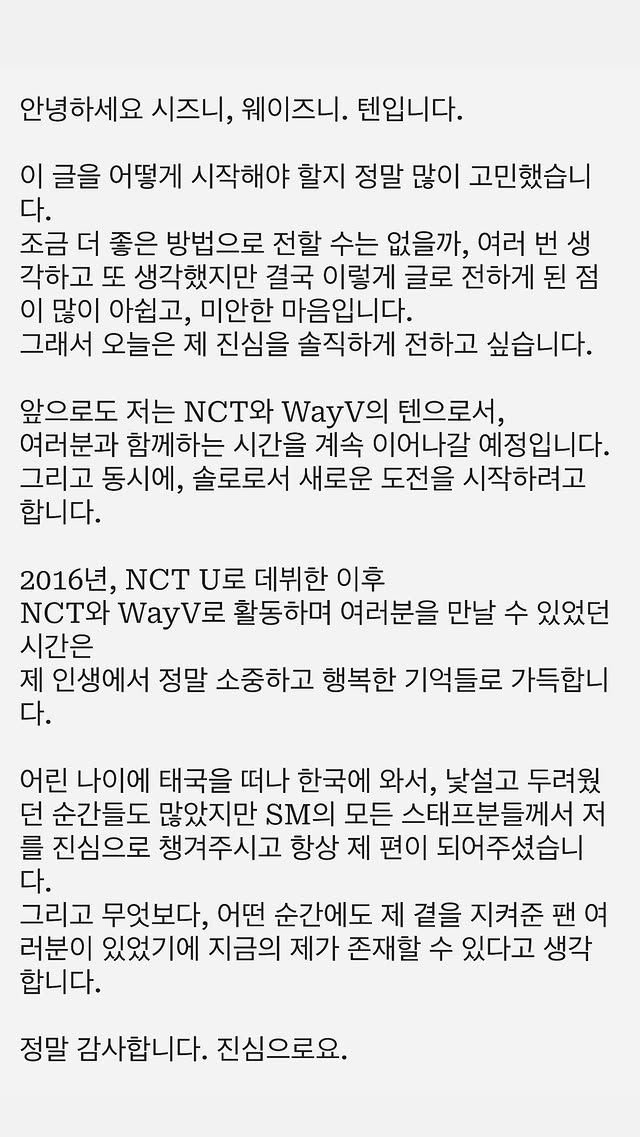 TEN坦言,隨著出道10周年將近,他開始認真思考下一步,也想挑戰新的事物、探索更多可能性,去看見更多不一樣的自己。因此在經過長時間思考,並與成員及SM工作人員深入溝通後,最終決定結束與SM的專屬合約。